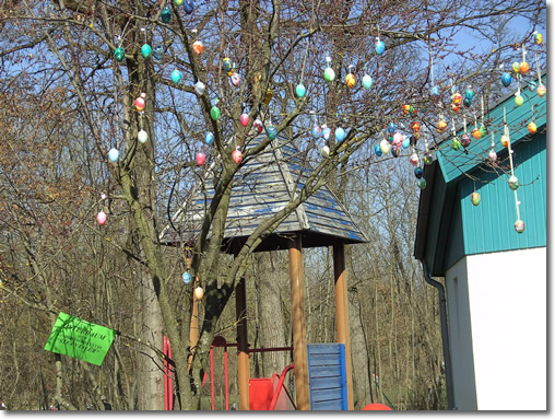 Mit viel Liebe, Farbe und Fanatasie wurden die Eier für diesen schönen Osterbaum von den Kindern des Eichenauer Sterntaler Kindergartens bemalt. Ein ebenso buntes Programm aus Liedern, Geschichten und Basteleien rund um den Osterhasen bereitete die Kinder auf die Osterfeiertage vor. Krönender Abschluß war die Osterfeier am letzten Tag vor den Ferien, zu der auch der Osterhase für jedes Kind etwas versteckt hatte.