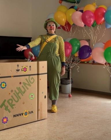Mit ihrem neuen Programm „Frühling im Karton“ brachten die beiden Clowns-Damen, Christiane und Renate, wieder einmal Frohsinn, gute Laune und strahlende Kinderaugen zum Glänzen.