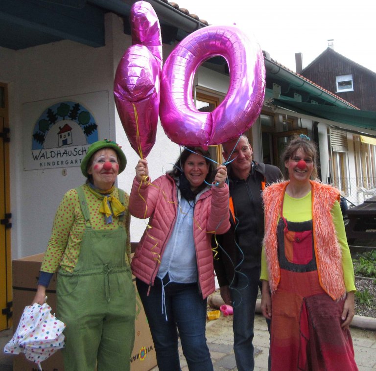 Das Waldhäuschen bedankt sich bei den Künstlerinnen für die tolle Vorstellung sowie bei der Gemeinde Eichenau für die Finanzierung des Auftritts, der ursprünglich für das coronabedingt ausgefallene Jubiläumsfest vorgesehen war. Als kleine Entschädigung gratulierten Knusper und Keks der Einrichtungsleitung Frau Krum und ihrem Stellvertreter Herrn Ehreth zum 20-jährigen Bestehen des Waldhäuschens mit den passenden Zahlen-Luftballons.