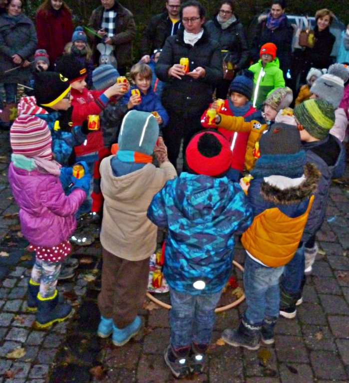 Zurück am Kindergarten stärkten sich die Familien bei Kinderpunsch, Glühwein und selbst gebackenen Martinsgänsen. Dabei lud die stimmungsvolle Beleuchtung und die Wärme der Feuerschale noch zum gemütlichen Beisammensein ein.